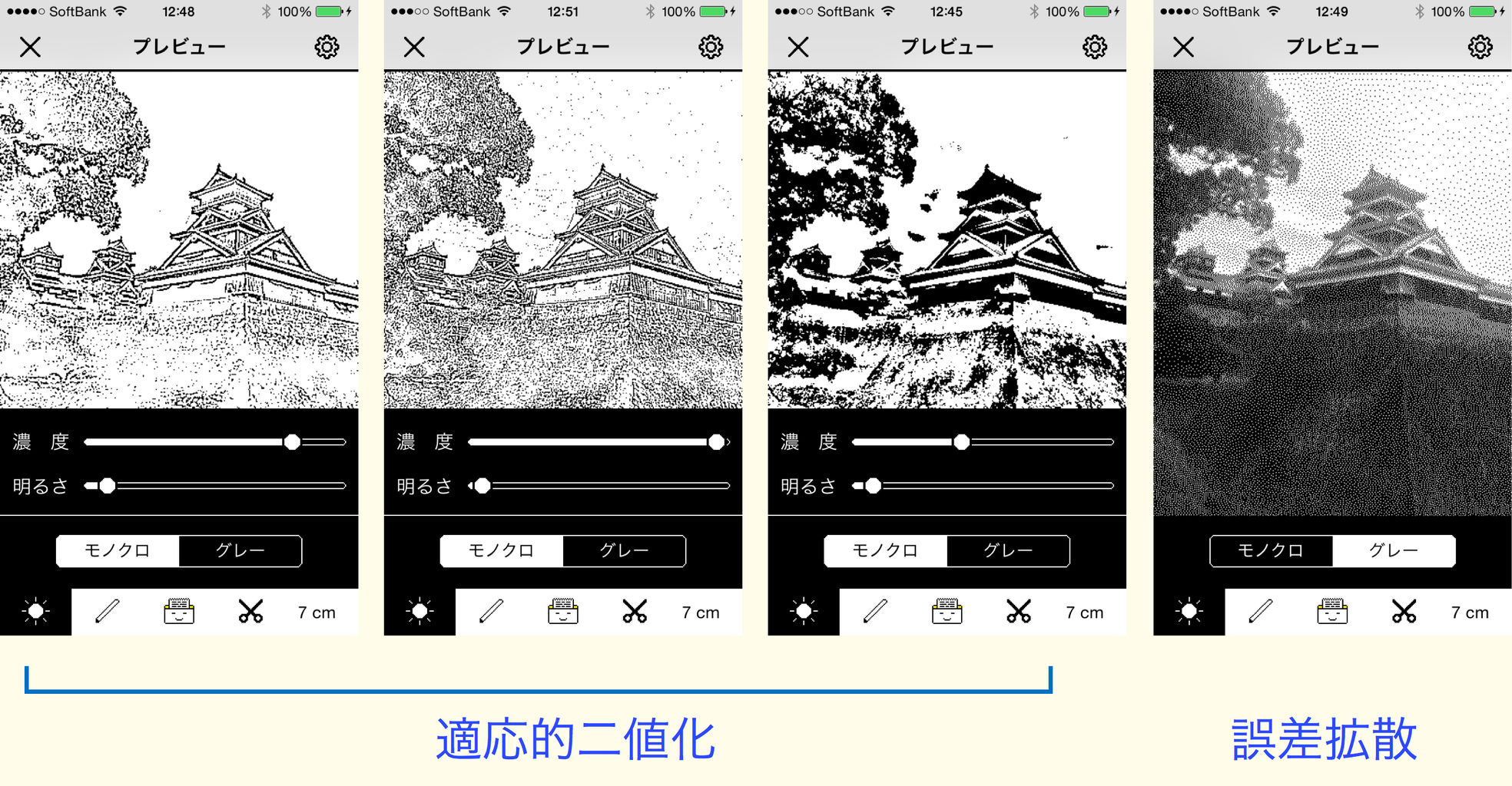 ロルトに印刷するためのiPhoneアプリ「Rolto」はロルト用に特殊な二値化の処理を行っています。一つは誤差拡散でインクジェットプリンター等でもよく利用されている方法です。もう一つは「二値化を行う点とその周りの濃さの平均との差で白か黒を決定する」方法です。文章では自分で書いていてもよくわからないので、実際にどんな絵になるか見てみましょう…
